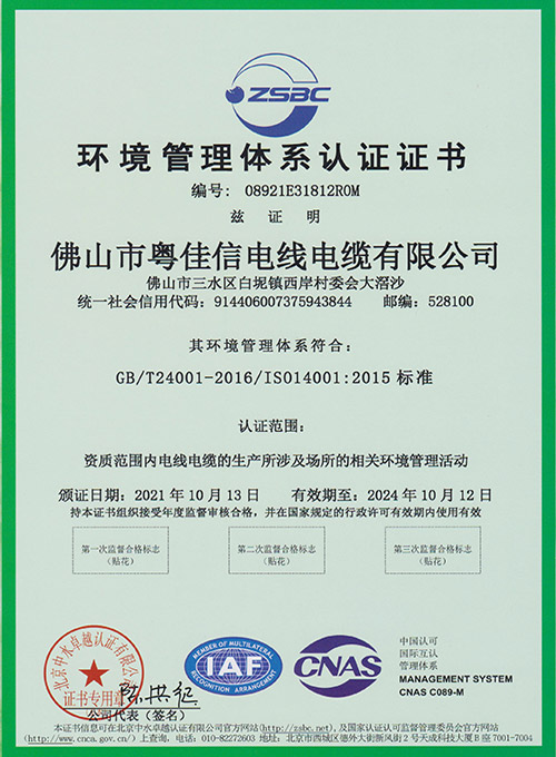 环境管理体系认证证书