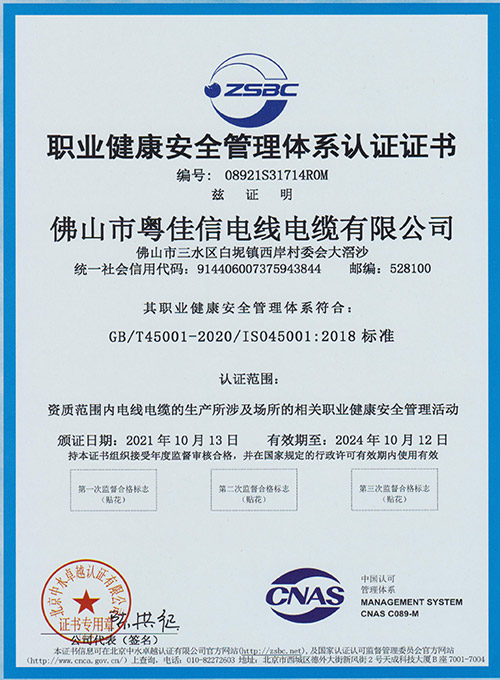 职业健康管理体系认证证书