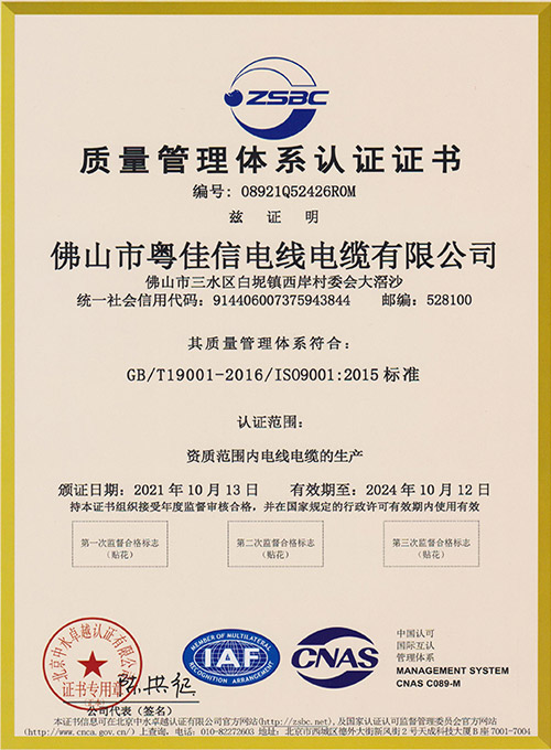 质量管理体系认证证书