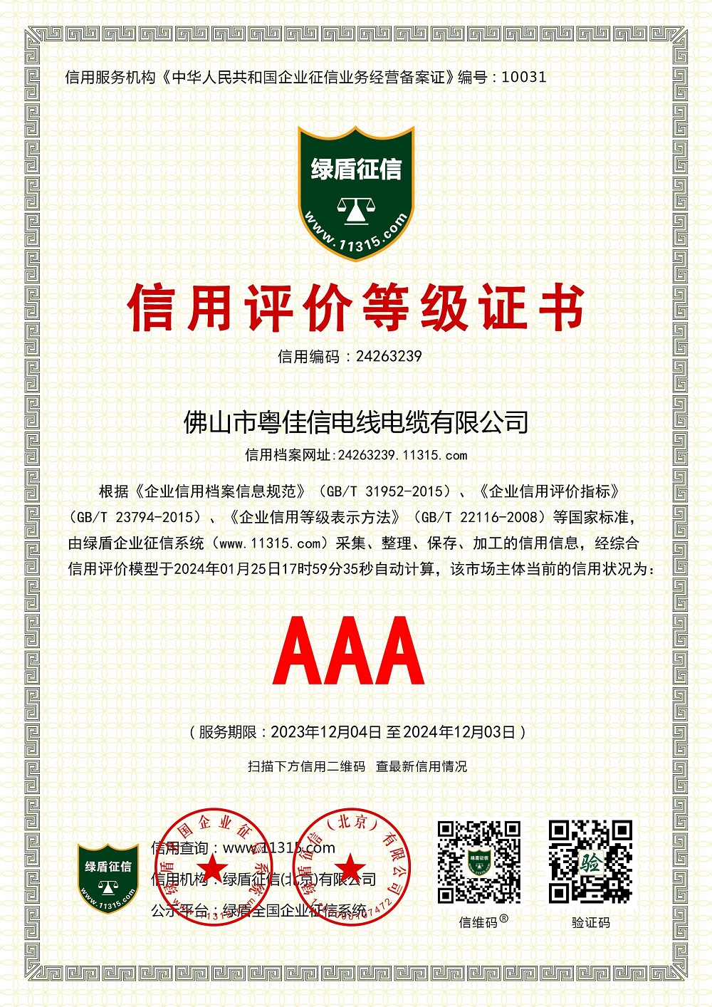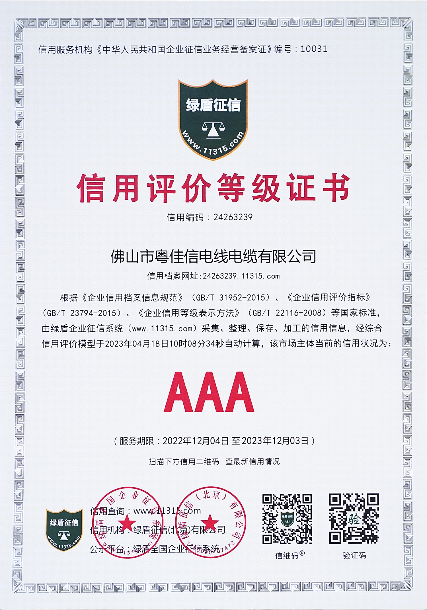 信用评价等级证书